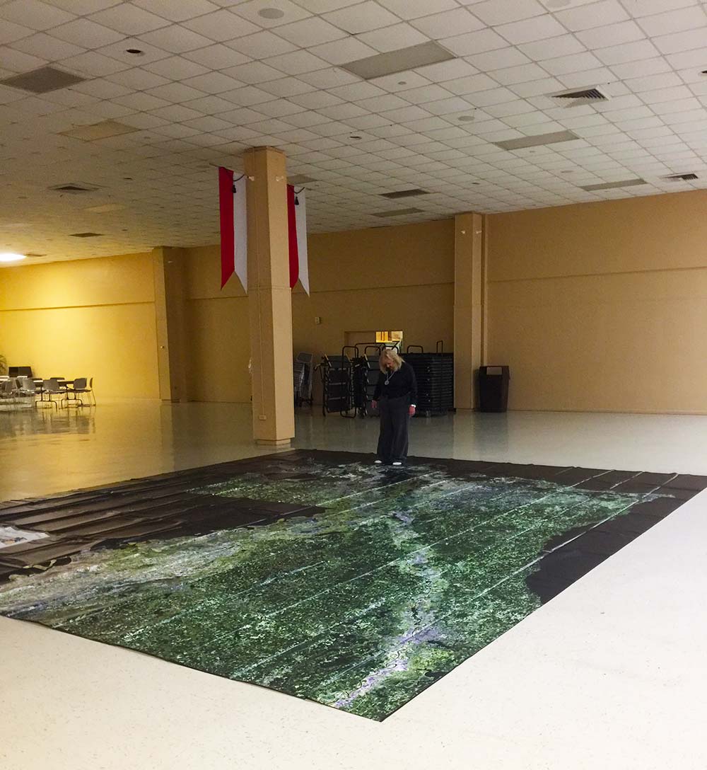 The Louisiana Floor map is a 16ft x 20ft map of Louisiana showing waterways, cities, topography, latitude and longitude lines and coastal land loss and restoration.